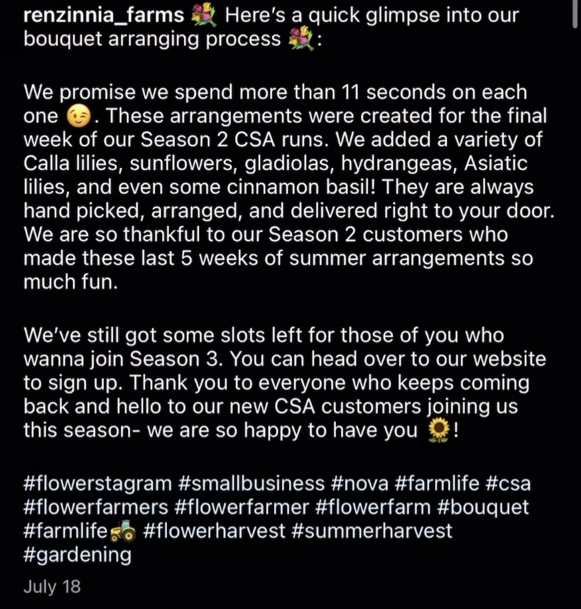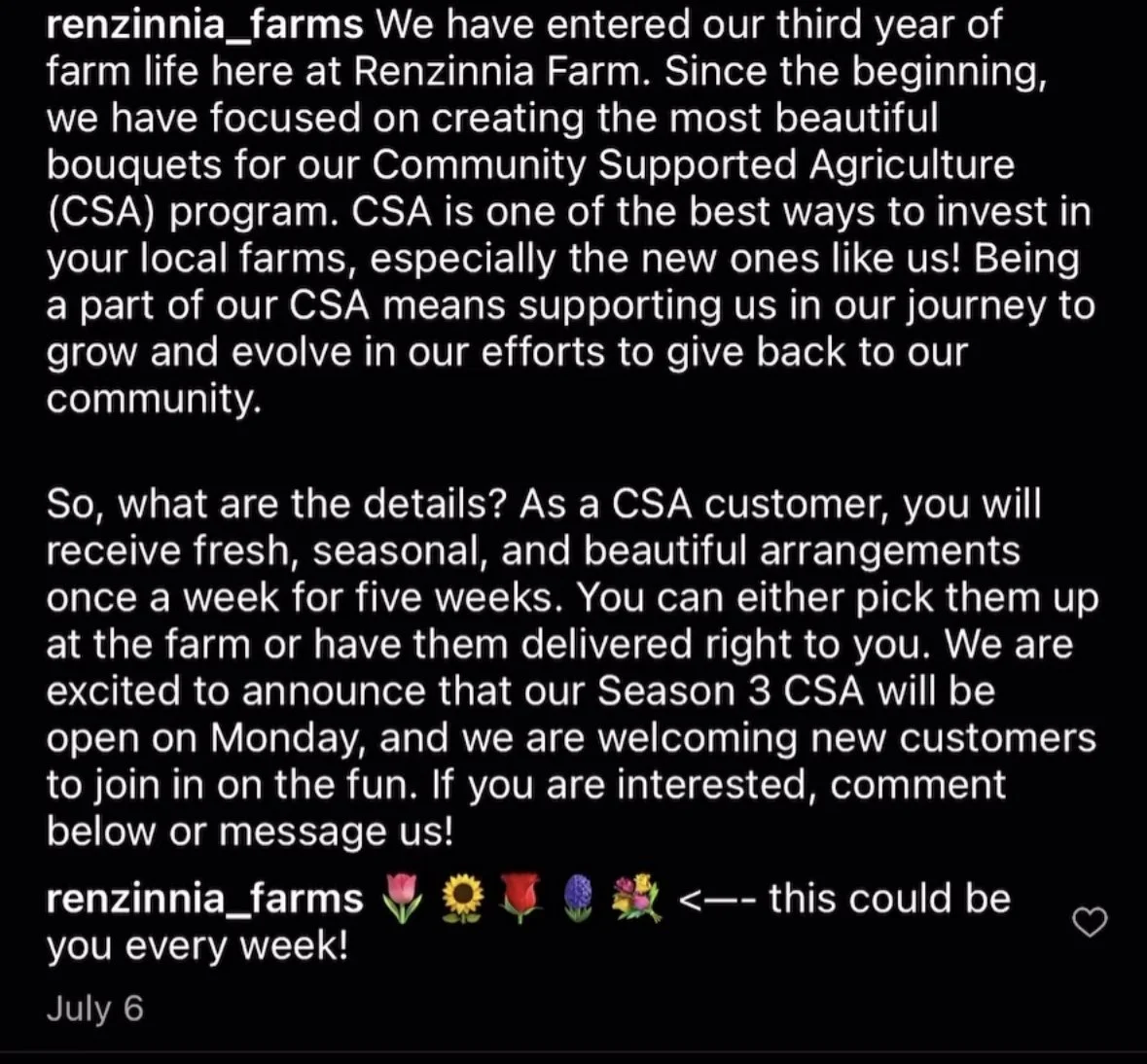 Community Supported Agriculture (CSA) has been the primary source of income for Renzinnia Farms since its inception. Given our 30% growth in followers by this point, I aimed to reintroduce it to both our existing and new audience.